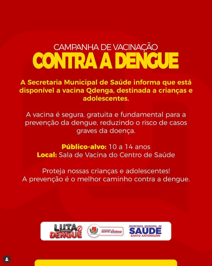 A Secretaria Municipal de Saúde de Santo Antônio/RN informa que a vacina Qdenga, segura e gratuita, está disponível para crianças e adolescentes de 10 a 14 anos.
