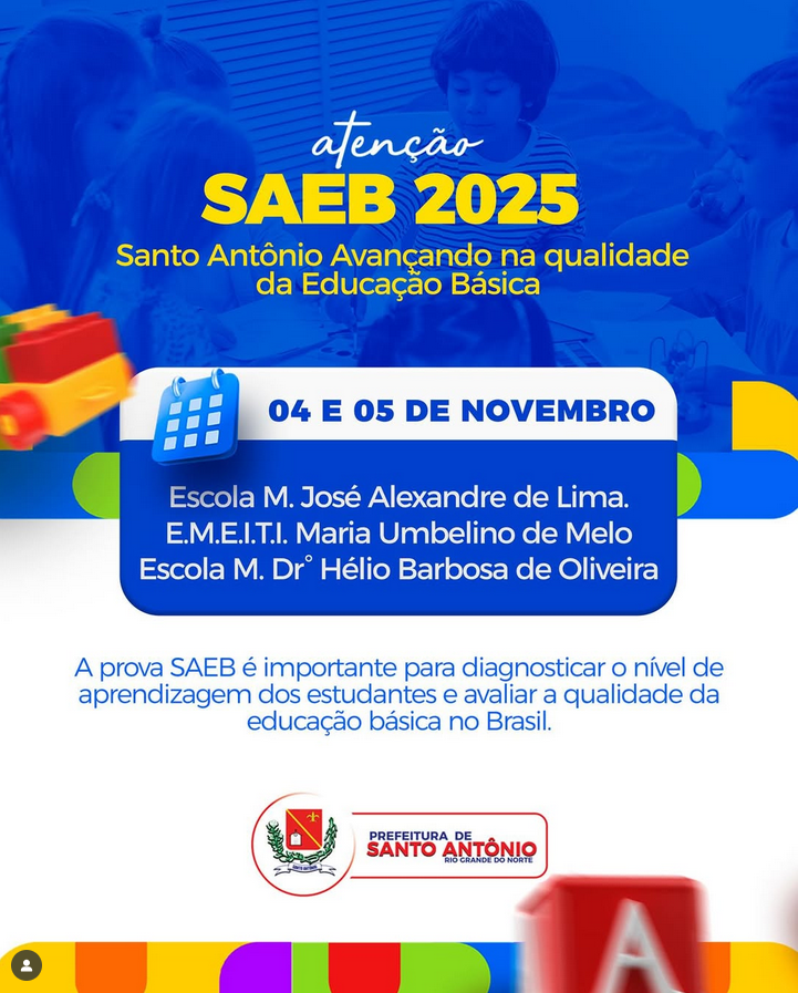 Nos dias 04 e 05 de novembro, acontecerá a aplicação do SAEB 2025 em Santo Antônio/RN.