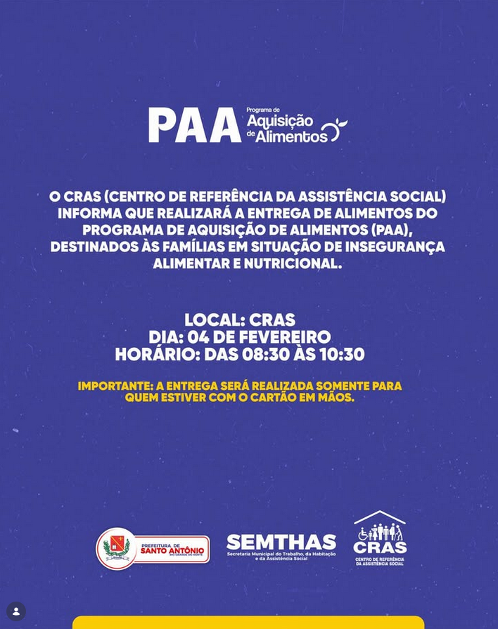 A Prefeitura de Santo Antônio, por meio da SEMTHAS e do CRAS, informa que realizará a entrega de alimentos do Programa de Aquisição de Alimentos (PAA), destinada às famílias em situação de insegurança alimentar e nutricional.