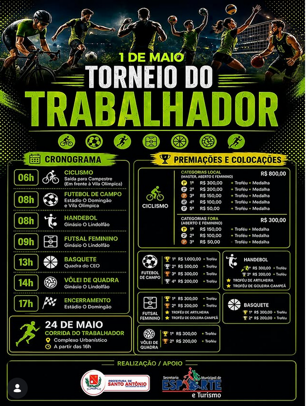 Vem aí o Torneio do Trabalhador com várias modalidades, competição saudável e muita emoção do início ao fim. Prepare sua torcida, reúna sua equipe e participe desse grande evento!