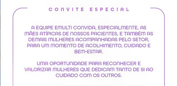 Convite EspecialA equipe Emulti convida, especialmente, as mães atípicas de nossos pacientes e também as demais mulheres acompanhadas pelo setor para um momento de acolhimento, cuidado e bem-estar.Será uma oportunidade de reconhecer e valorizar mulheres que dedicam tanto de si ao cuidado com os outros. Terça-feira, 17 de março 09h Local: Setor Emulti […]